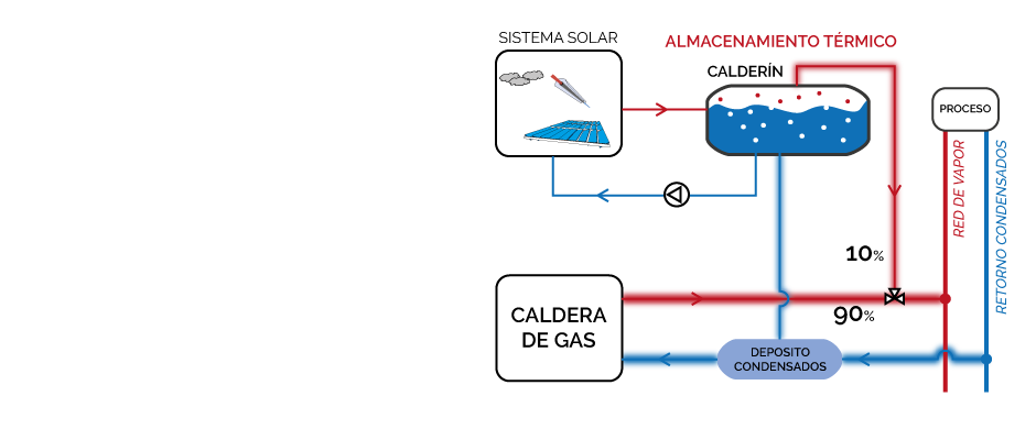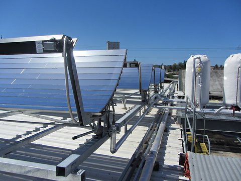 Para conseguir calentar un fluido a la temperatura que necesitan los procesos industriales se utilizan colectores solares de concentración. Los colectores de concentración actuales alcanzan temperaturas de hasta 400ºC, por lo que son capaces de suministrar vapor (o cualquier tipo de fluido) a la misma temperatura y presión, que las calderas utilizadas por la mayoría de industrias. Aunque la energía solar sólo está disponible durante el dia, esta puede almacenarse facilmente para su uso posterior.
